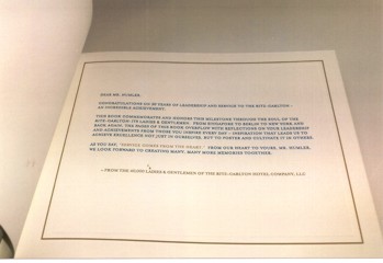 Hi Paul, I never did speak with you after yoiu completed the book for The Ritz-Carlton Founder. I want to let you know that it was a huge success. In fact, the book totally eclipsed a touching mulit-media presentation that the company's marketing department presented at the event. My client was very pleased and received the highest praise from everyone in attendance! You not only met an impossible schedule, yoiu also exceeded our high expectations. |